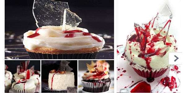 4. Usa el vidrio de azúcar transparente y un glaseado rojo en gel para cubrir magdalenas aterradoras. Glasea algunas magdalenas con un glaseado blanco de crema de mantequilla. Coloca pedazos de vidrio de azúcar transparente. Vierte el glaseado para escribir o en gel de color rojo sobre los bordes superiores del azúcar glas.